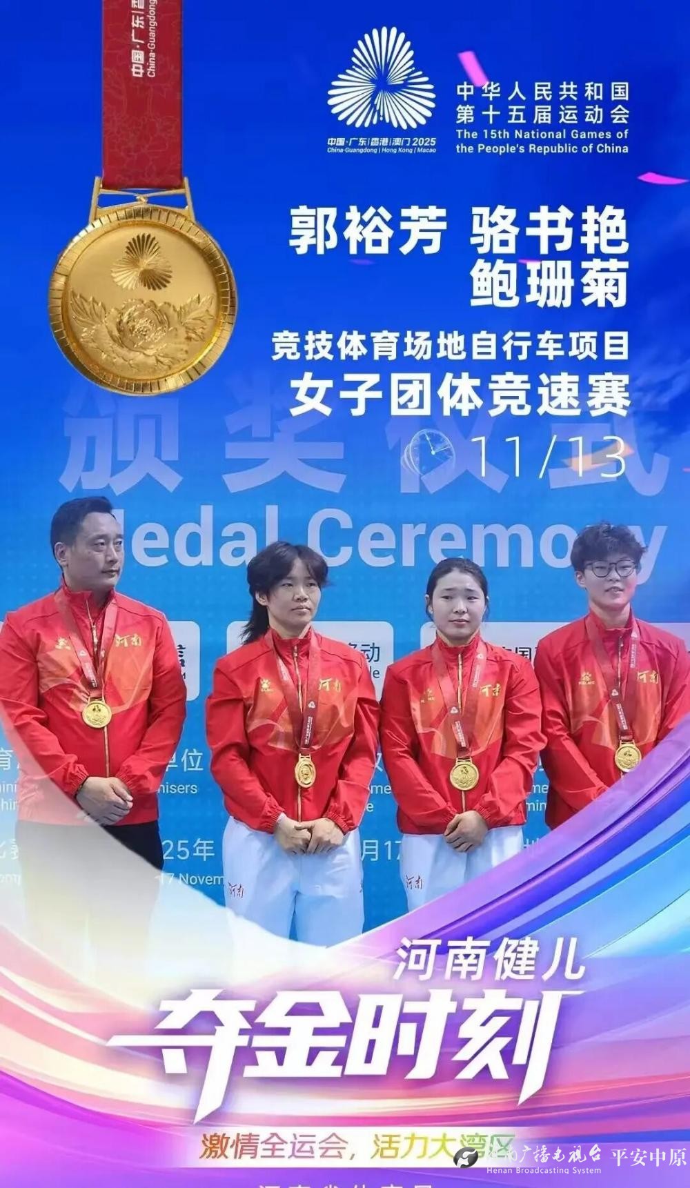 骆书艳(右一) 11月13日晚,第十五届全运会赛场传来捷报,在全运会场地自行车女子团体竞速赛中,驻马店籍运动员骆书艳与队友同心协力、顽强拼搏、勇夺桂冠! 这是河南队参加第十五届全运会取得的第三金,也是驻马店运动员为河南贡献的第二金! 骆书艳,驻马店驻马店市正阳县人,2021年由驻马店市输送到省自行车队。近年来,她屡创佳绩,先后荣获场地自行车全国联赛冠军、亚洲青年锦标赛冠军、亚洲锦标赛冠军等殊荣,为河南争光,为家乡添彩,成为驻马店运动员的优秀代表! 2025年全国场地自行车锦标赛暨2025年全国青年场地自行车锦标赛夺冠 “巴迪瑞杯”2025年中国场地自行车联赛总决赛夺冠 2025年亚洲场地自行车锦标赛夺冠 责任编辑|马春丽 初审|葛纯强 审核|杨婉嘉 统筹|张一斐 |