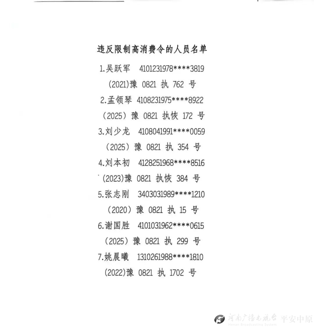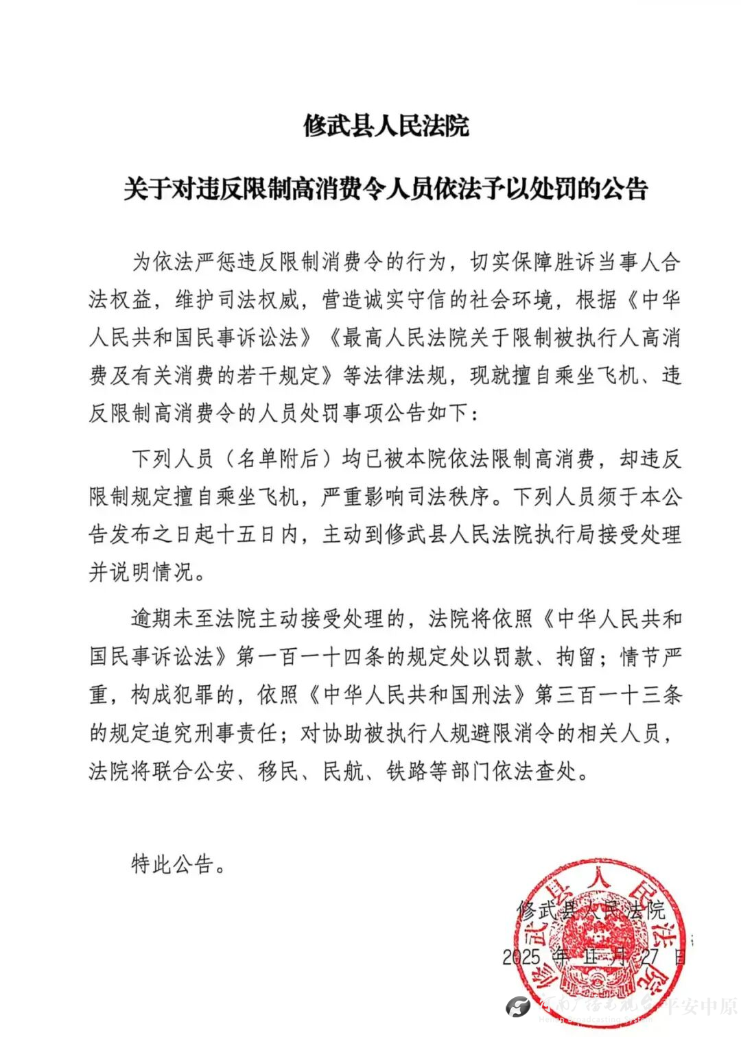 | 为坚决打击违反限制高消费令行为,维护司法权威,2025年11月27日,修武县人民法院正式发布《关于对违反限制高消费令人员依法予以处罚的公告》,对7名违令乘坐飞机的被执行人集中曝光。这也是焦作地区法院系统首份针对违反“限高令”行为的专项惩戒公告,彰显了法院依法惩治失信行为的决心。