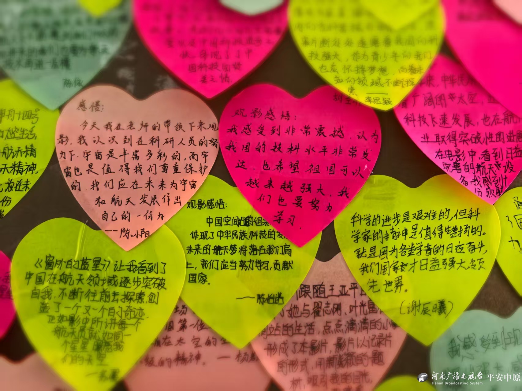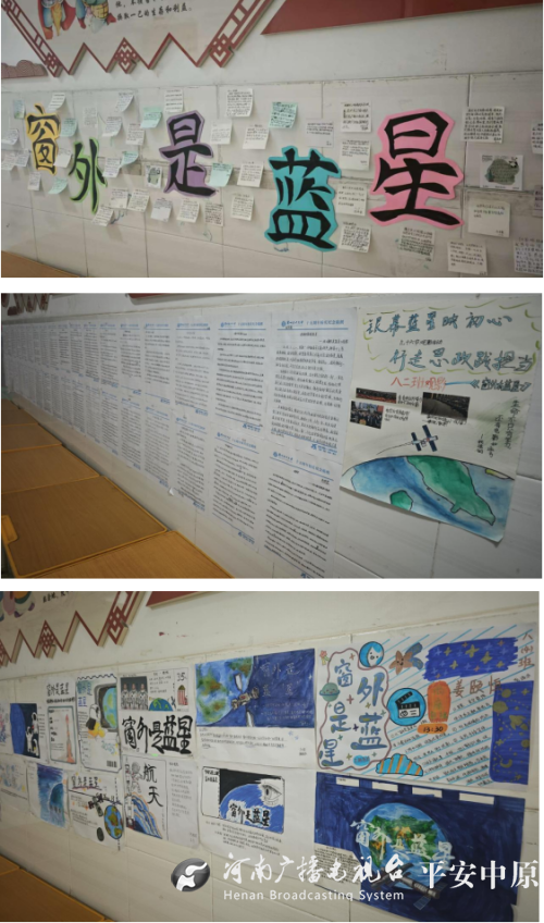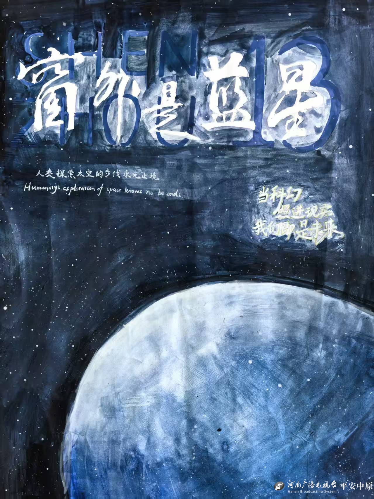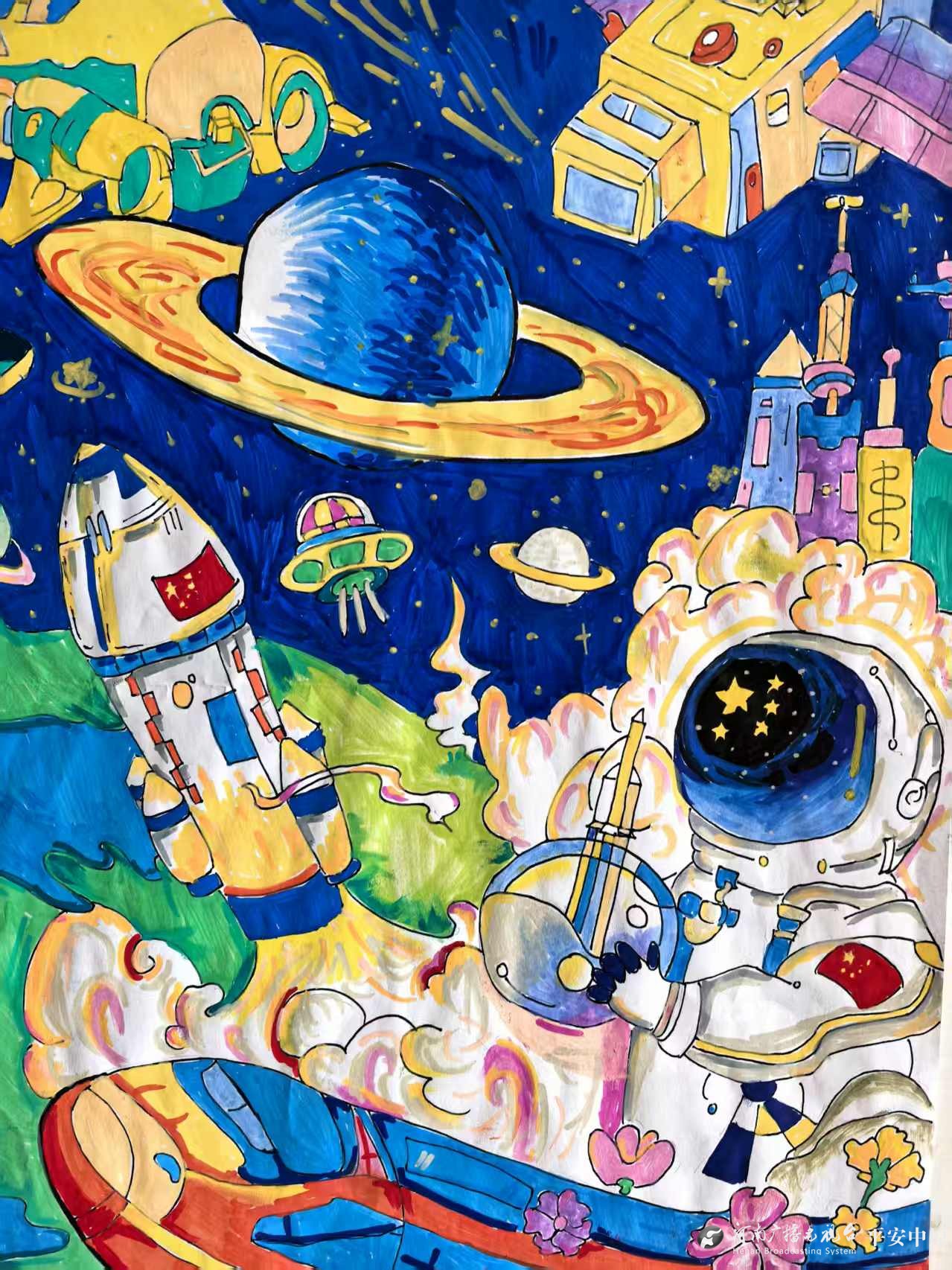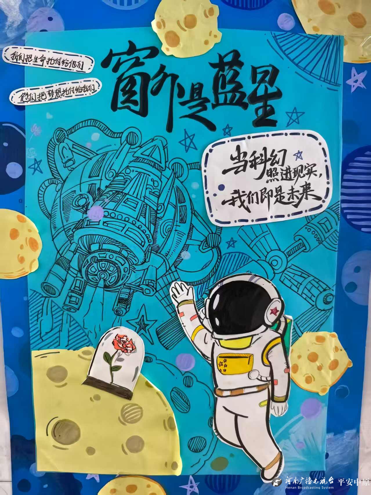 领航八班张航秋忆则聚焦航天人的硬核担当:“从前我并不晓得宇航服的沉重,直到从影片里看到航天员在狭小空间完成精细作业,才明白中国宇航员的毅力与专业。”当镜头扫过空间站舷窗里的地球,他写下:“看着这颗我们居住的星球,不禁感慨中国航天科技的进步,我们为之自豪! 教室外的“心愿墙”上,一颗颗彩色心形便利贴承载着学子们的赤诚。“愿祖国航天事业蒸蒸日上”“我要像航天员一样,为梦想执着奋斗”“希望未来能为中国航天添砖加瓦”……稚嫩的笔迹里,是对家国的祝福,更是对自我的期许。这些心愿与旁边鲜红的国旗装饰交相辉映,将个人梦想融入家国蓝图。 学生们的手绘作品更是创意满满:有的以梵高式笔触描绘火箭升空,中国空间站与土星环在深蓝宇宙中交相辉映;有的创作水彩风格的《窗外是蓝星》海报,让“人类探索太空的步伐永无止境”的信念跃然纸上;还有的通过手抄报,将影片中火箭发射、空间站对接的震撼瞬间与个人感悟结合,让航天梦在笔尖生根。