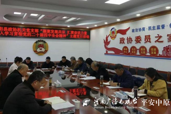 11月25日,驻马店市正阳县政协机关党支部开展“凝聚发展共识,汇聚奋进力量——深入学习贯彻党的二十届四中全会精神”主题党日活动。正阳县政协党组副书记、副主席张雁等领导干部以普通党员身份参加。 活动中,大家集中学习了《中国共产党第二十届中央委员会第四次全体会议公报》和《中共中央关于制定国民经济和社会发展第十五个五年规划的建议》,并围绕党的二十届四中全会提出的战略任务和全县发展大局,畅谈学习感悟,积极建言献策。 张雁强调,要深学细悟党的二十届四中全会精神实质、核心要义和实践要求,切实把学习成果转化为履职尽责的积极性和主动性。要把学习贯彻全会精神作为当前和今后一个时期的重大任务,聚焦全县发展大局,以过硬的工作作风展现新时代政协机关干部职工的担当作为。要聚焦主责主业,提升履职质效,以正阳县委巡察反馈问题整改为契机,引导各界别委员深入学习贯彻全会精神,对照年初工作目标,做好全年工作收官。(通讯员:贺永明) 责任编辑|马春丽 初审|葛纯强 审核|杨婉嘉 统筹|张一斐