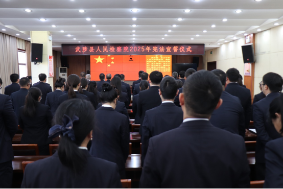 举行宪法宣誓仪式。12月3日上午,武陟县检察院在五楼会议室举行宪法宣誓仪式。仪式开始,全体干警整齐肃立,奏唱《中华人民共和国国歌》。面向鲜艳的五星红旗,检察干警高举右拳,庄严宣誓,铿锵有力的誓言在会场内回荡,充分展现了新时代检察干警忠诚履职,为大局服务、为人民司法、为法治担当,持续高质效办好每一个案件的坚定信念。宣誓结束后,干警们纷纷表示:将铭记铮铮誓言,强化使命担当,以时不我待、只争朝夕的奋斗精神持续推进习近平法治思想的检察实践,奋力书写新时代检察工作高质量发展的崭新篇章!