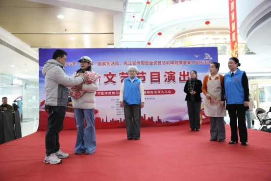 万达广场内部的法治文艺汇演成为本次活动的创新亮点,多种表演形式为“宪法宣传周”活动注入新活力。山阳区司法局带来的快板《冬香站里普法忙》率先登场,朗朗上口的唱词再现“冬香好妈妈家事调解工作站”化解邻里纠纷的日常,将基层治理实践融入通俗文艺,引发台下观众共鸣;沁阳市人民法院的情景剧《锦旗映得党旗红》创新融入说唱元素,全面展示跨域立案、家事调解等日常工作场景,生动展现司法为民实践,赢得现场观众掌声;解放区司法局的独舞《万疆》以悠扬旋律搭配舒展舞姿,勾勒出法治守护下的家国安宁,用艺术感染力传递宪法温度。“这种形式比单纯讲法条好懂多了,连孩子都跟着记住了‘遇事找法’”,带着孙女打卡的市民张大爷说道。
