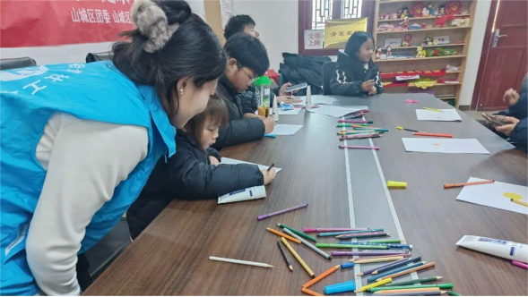 | 长桌上铺满彩色铅笔和画纸,鹤壁市山城区团委志愿者耐心指导孩子们用画笔表达内心世界。12月19日,三十余名儿童围坐在一起,在“青翼家园”的活动室里,共同参与这场以“拥抱内心阳光”为主题的心理健康服务活动。