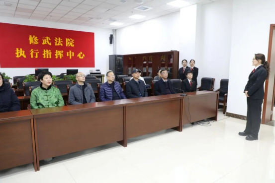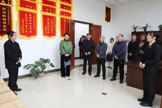 沉浸式参观:感受司法便民与智慧建设 在法院工作人员的引导下,代表们依次参观了新审判法庭的诉讼服务中心、刘玲调解工作室、人大代表联络站、执行指挥中心等功能区域,全方位了解了修武法院在诉讼服务、多元解纷、代表联络、智慧执行等方面的工作成效。