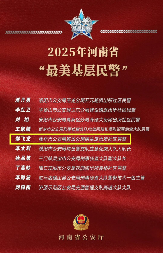 | 1月8日,河南省公安厅举行警耀中原——2025河南“最美基层民警”主题报告会,揭晓2025河南“最美基层民警”。其中,焦作市公安局解放分局民生派出所民警郜飞龙被评为2025河南“最美基层民警”。