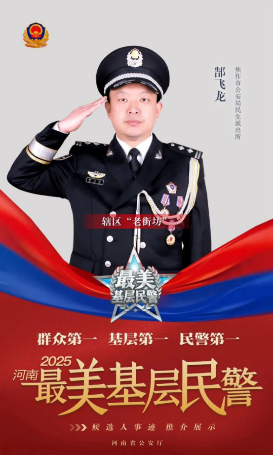人物简介 郜飞龙,男,汉族,44岁,焦作市公安局解放分局民生派出所“郜飞龙警务室”社区民警。从警22年来,他先后荣立个人三等功3次,获评全市“优秀公务员”“最美警察”“优秀社区民警”“矛调能手”“抓逃能手”等多项荣誉称号。