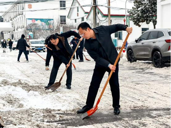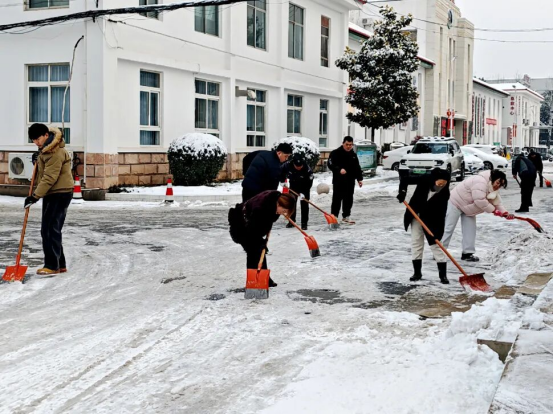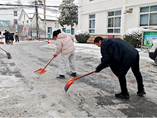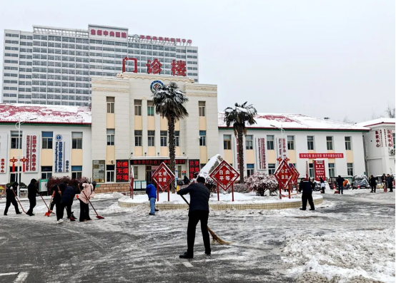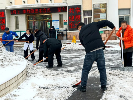 冒着凛冽的寒风,大家迅速集结、现场分工,有序拿起铁锹、扫帚、雪铲等工具,齐心协力、配合默契,有的弯腰用铁锹撬起结冰的路面,有的手持扫帚清扫残余积雪,合力将成堆的积雪清运至指定区域,确保不留一处死角、不存一处隐患。经过近两个小时的奋力协作,院区主干道积雪被基本清除,为前来就诊的患者开辟出了一条“暖心通道”。同时,在坡道等易滑区域铺设防滑地毯,方便患者及家属清理脚底积雪,最大程度降低滑倒风险。