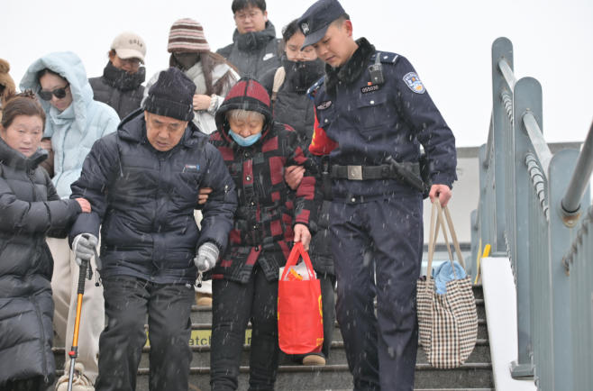 搀扶守护,温暖特殊旅途 对于老人、孕妇、带小孩的旅客等需要重点照顾的群体,守护更加细致入微。民警与客运员主动上前,或稳稳搀扶臂膀,或小心引导步伐,一路护送他们安全通过湿滑区域,直至安稳落座。每一个放缓的脚步,每一次用力的搀扶,都是对“人民至上”最朴素的诠释。