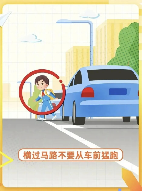 远离车辆盲区 盲区大致可以分为车内“固定”视线盲区和车外“移动”视线盲区。车内“固定”视线盲区包括车头盲区、A柱遮挡形成的盲区、车尾盲区等。 当孩子在盲区内蹲下停留、玩耍时,在驾驶室内无法看到,很容易发生碰撞事故。家长们要警惕盲区带来的伤害,注意教会孩子不在停驶的车辆周围玩耍,要和车辆保持安全距离等。