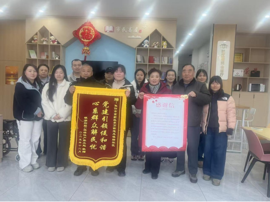 一波刚平,一波又起。 该小区又因工程款纠纷出现车库堵门问题,车辆无法正常进出,居民出行受阻。社区再次主动介入,组织涉事各方坐下来协商,厘清责任边界、敲定付款节点,最终化解了这场僵持多日的纠纷。难题迎刃而解,居民与物业满心感激,联合送来锦旗,向社区表达谢意。 第三面锦旗