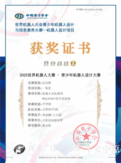 2026年1月,2025世界机器人大赛总决赛在江苏无锡开幕,作为2025年度收官之战,决赛吸引了来自中国、俄罗斯、美国、日本等21个国家的2万余名选手参与。大赛围绕“技术产业类”和“综合素质类”设置相关竞赛项目,参赛人群覆盖全年龄段,2025年全年参赛人数突破35万人次。在这场汇聚全球青少年科技英才的顶尖赛事中,驻马店市正阳县高级中学周昆鹏、王天磊同学凭借出色表现,在竞争激烈的“机器人对抗赛项——WHALESBOT星空竞技场”中脱颖而出,荣获一等奖。 据悉,由中国电子学会主办的世界机器人大赛自2015年起已成功举办了10届,共吸引了全球20余个国家近100万名选手参赛,被誉为机器人界的“奥林匹克”。通过多年的积淀成长,大赛已发展成为国内外影响广泛的机器人领域官方专业赛事。培养具有国际视野和创新能力的新时代人才。 周昆鹏、王天磊同学从小对机器人充满好奇与热情。课堂上,他们总是那个踊跃提问、积极动手的身影。社团活动中,他常常为了优化一个代码模块,利用双休时间在学校的机器人实验室调整一个机械结构而沉浸数小时。这份对科技纯粹的热爱,成为他不断探索的动力源泉。 正阳县高级中学始终将科技教育摆在重要位置,致力于培养学生的科学素养与创新实践能力。学校配备机器人实验室等先进设施,构建起覆盖全校的科技课程与社团活动体系,不断拓展学生视野。 责任编辑|马春丽 初审|葛纯强 审核|杨婉嘉 统筹|张一斐 |