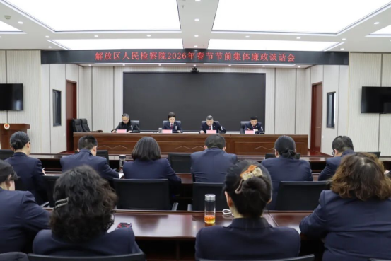 | 2月4日,焦作市解放区人民检察院召开春节节前集体廉政谈话会。会议由党组副书记、副检察长赵爱民主持,全体干警参加。