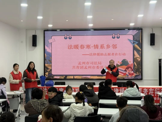 2月3日,焦作市法律援助中心联合市司法局示范区分局,在李万街道耿作村拉开活动序幕。天津外国语大学大一学生张馨予刚学完《宪法》便主动请缨:“能把课堂知识带给乡亲们,学以致用的感觉特别踏实!”志愿者们围绕土地承包、邻里纠纷、家庭继承等农村常见法律问题,用贴近生活的案例引导村民依法办事。现场发放法律援助指南120余份,解答咨询5人次,法治种子在寒冬悄然播下。 孟州市:托管班里的法治公开课