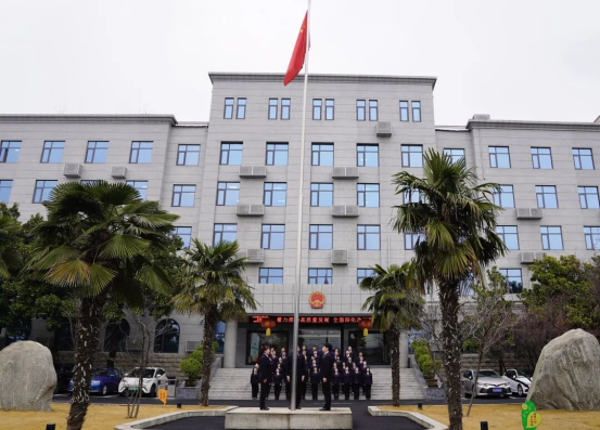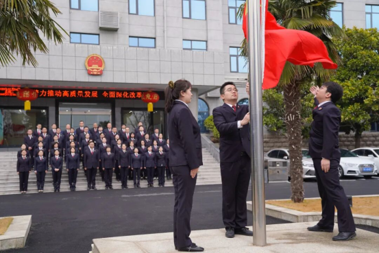 上午9时,升国旗仪式正式开始。伴随着雄壮激昂、催人奋进的《义勇军进行曲》,在全体干警的庄严注目下,五星红旗冉冉升起、迎风飘扬,每一位干警心中都涌动着对祖国的无限热爱和崇高敬意。