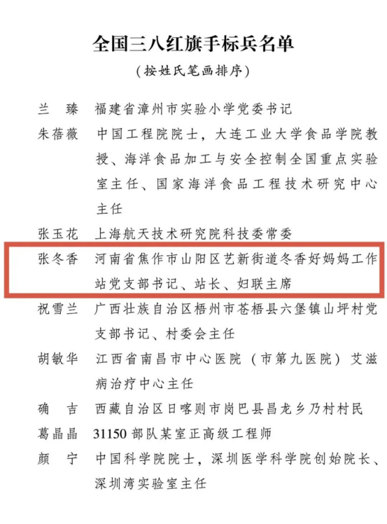 | 3月2日,全国妇联公布2025年度全国三八红旗手标兵名单,河南省焦作市山阳区艺新街道“冬香好妈妈工作站”党支部书记、站长、妇联主席张冬香光荣当选。