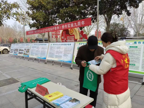 活动现场,工作人员通过设置宣传展板、摆放宣传展台、发放宣传资料、现场答疑解惑等方式,全方位解读《北山条例》核心内容。工作人员耐心解答群众关心的北山保护范围、违规行为处罚、生态修复进展等热点问题,详细讲解破坏北山生态环境的法律后果。同时,向过往市民发放《北山条例》宣传折页、环保手册等资料,呼吁大家主动参与到北山保护中来,争做生态环境的守护者、法治精神的践行者。 博爱分局 焦作市生态环境局博爱分局积极参与《北山条例》实施九周年集中宣传活动。