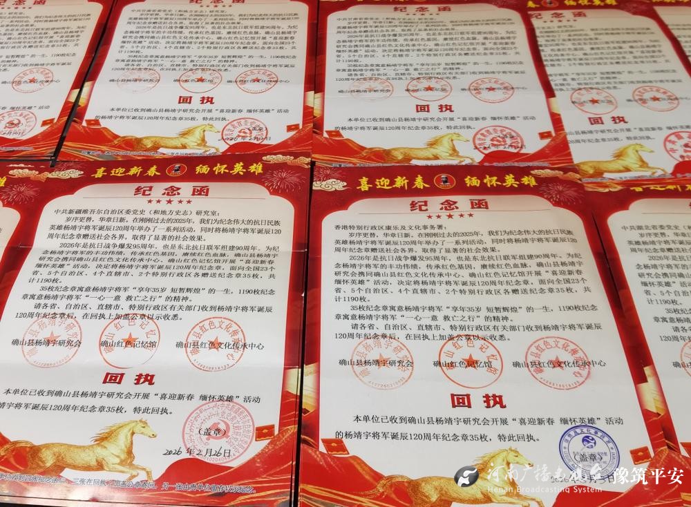 3月21日,随着香港康乐及文化事务署回执公函顺利抵达,由河南省确山县杨靖宇研究会、确山县红色文化传承中心、确山红色记忆馆联合主办的“喜迎新春 缅怀英雄”主题纪念活动圆满落幕。小小纪念章跨越千里,将抗日民族英雄杨靖宇的赤胆忠心与家国情怀,传递到祖国大江南北。 今年是抗日战争爆发95周年,也是东北抗日联军组建90周年。在这一具有重要历史意义的节点,确山作为杨靖宇将军的故乡,精心组织此次红色纪念活动,以赠送纪念章的形式缅怀革命先烈、弘扬英雄精神、传承红色基因。 活动面向全国23个省、5个自治区、4个直辖市及2个特别行政区的34个相关部门,每地赠送35枚纪念章,总计1190枚。数字之中饱含深意:35枚,象征杨靖宇将军35岁短暂而壮烈的一生;1190枚,寓意将军“一心一意、救亡之行”的坚定信念与崇高追求。每一枚纪念章,都是对英雄的深切缅怀,都是对革命精神的生动传承。 杨靖宇将军是东北抗日联军的主要创建者和领导人。在艰苦卓绝的抗日战争中,他率领抗联将士转战于白山黑水之间,在极端恶劣的环境下与日寇浴血奋战。弹尽粮绝之际,他仍孤身与敌人周旋数日,誓死不降,用生命谱写了一曲感天动地的英雄壮歌,铸就了中华民族不屈不挠的精神丰碑。 杨靖宇将军之孙马继民表示,一枚纪念章就是一份传承、一份责任、一份激励。此次活动不仅是对先烈的告慰,更是希望以实物为载体,让更多人了解英雄事迹、铭记历史使命,引导全社会崇尚英雄、学习英雄、关爱英雄,让红色血脉代代相传。 从豫南确山到香江之畔,从内陆腹地到边疆海滨,一枚枚承载英烈精神的纪念章,搭建起跨越地域的红色桥梁。香港方面的回执回函,既是对民族英雄的由衷敬仰,也是对红色文化传承的积极响应。 此次活动的圆满完成,进一步彰显了确山深厚的红色底蕴。下一步,确山县将继续用好红色资源、讲好红色故事,持续开展形式多样的爱国主义教育活动,让英雄精神融入血脉、浸润人心,激励广大干部群众从革命历史中汲取奋进力量,在新时代新征程上勇毅前行。(通讯员:李鹏飞) 责任编辑|马春丽 初审|葛纯强 审核|杨婉嘉 统筹|张一斐 |