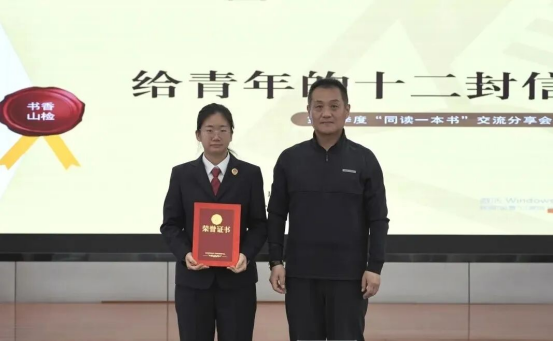 分享结束后,院党组成员、副检察长朱辉进行了总结点评。经过全体干警现场投票,吴茜荣获本季度读书会“最佳讲述者”。院党组成员、副检察长张伟为其现场颁奖。(通讯员 冯琳娜 张晨曦) 责任编辑|潘姝敏 初审|孟宪超 审核|杨婉嘉 统筹|张一斐