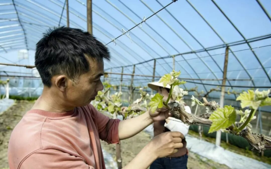 一旁的瞿向霞接过话茬:“前阵子刚给葡萄施了肥,浇了水,就盼着这些芽能好好长。你看这新抽的枝条,比去年壮实多了,只要管理跟上,今年肯定能有个好收成。”她抬头看了看架上的藤蔓,眼里满是期待,“去年阳光玫瑰卖得不错,好多老客户都提前预订,今年我们把管理做得更细,希望能多收点,多挣点钱。”