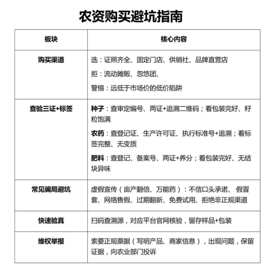 春耕秋收,农资是种地的核心保障,种子、农药、肥料选得好不好,直接关系到一年的收成。但眼下,流动“忽悠团”、假冒伪劣产品、虚假宣传层出不穷,不少农户一不小心就踩坑,买了劣质农资,不仅白花钱,还会导致减产绝收,损失惨重。今天就给大家整理一份农资购买避坑指南,从选渠道、查资质、防骗局到维权,让身边的乡亲都能避开陷阱!