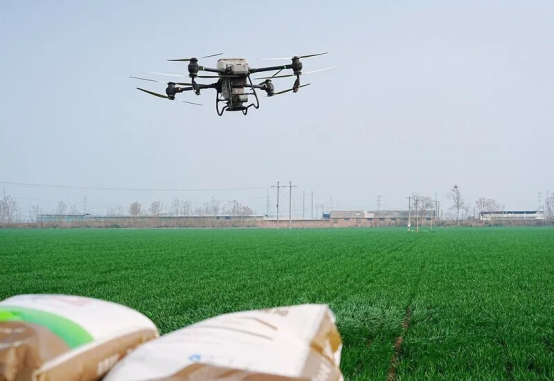 | 春日融融,沃野披绿。近日,在河南省孟州市城伯镇西武章村的麦田里,一架植保无人机满载复合肥,在操作手的遥控下平稳升空,伴随着旋翼的嗡鸣,肥料均匀洒向绿油油的麦苗。