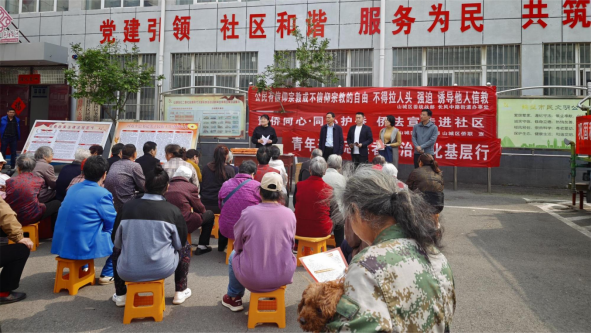 | 为深入贯彻落实国家宗教政策,进一步增强居民的法律意识和民族团结观念,引导居民正确理解宗教信仰自由政策,4月14日下午,鹤壁市山城区委统战部携手长风中路街道红二巷社区组织开展铸牢中华民族共同体意识暨民族宗教政策法规宣传活动。辖区党员、居民代表等30余人参加。