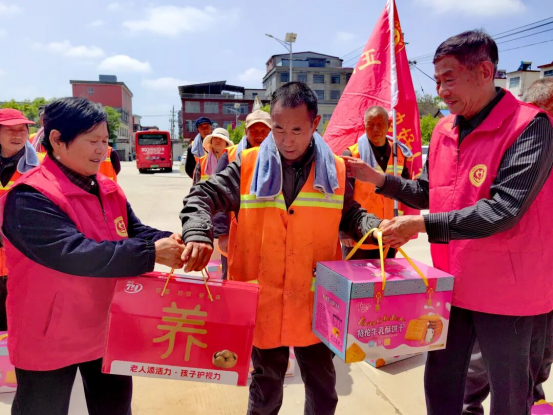 本次公益慰问活动,由“中国好人”潘永锋、涂善珍夫妇牵头发起。两位老人是正阳县大林镇人,数十年勤俭自持,主动拿出个人养老金,持续帮扶环卫工人、孤残儿童、困难群众等弱势群体,累计参与公益好事1500余次,捐款捐物价值数十万元。在他们的善行感召下,爱心接力好人志愿服务队凝聚起100余名热心公益的爱心人士,天中大地好人力量不断汇聚,此次大家再度同心携手,奔赴基层传递温暖。 上午10时40分,汝南埠镇活动现场暖意融融,“四地好人联动献爱心,五一佳节情暖环卫人”的条幅格外醒目。身着橙色工装的环卫工人整齐列队,脸上洋溢着质朴的笑容。汝南埠镇党委、政府负责人现场致辞,向远道而来的四地好人表示热烈欢迎,向常年坚守一线的环卫工人致以崇高敬意。