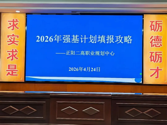 为帮助高三学子精准把握强基计划政策,拓展升学渠道,4月24号夜晚,驻马店市正阳县第二高级中学在明德楼八楼报告厅举办2026年强基计划填报攻略专题讲座。